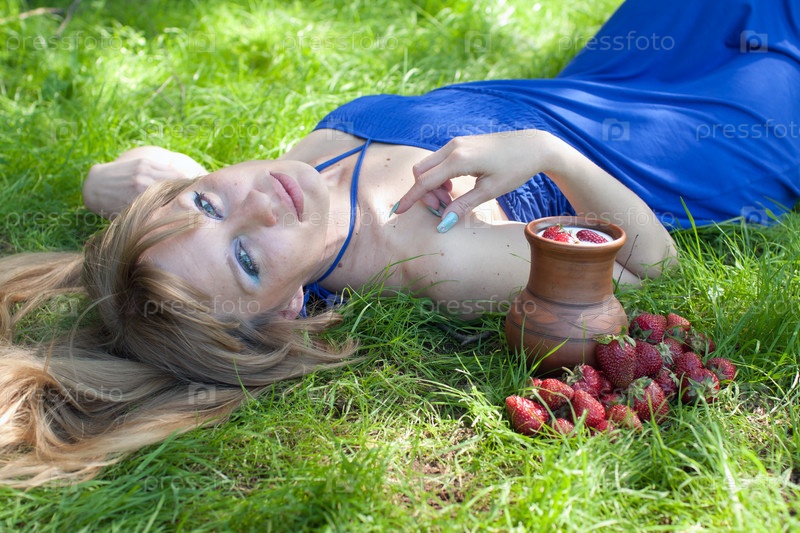 Молодая женщина с молоком и клубникой на зеленой траве