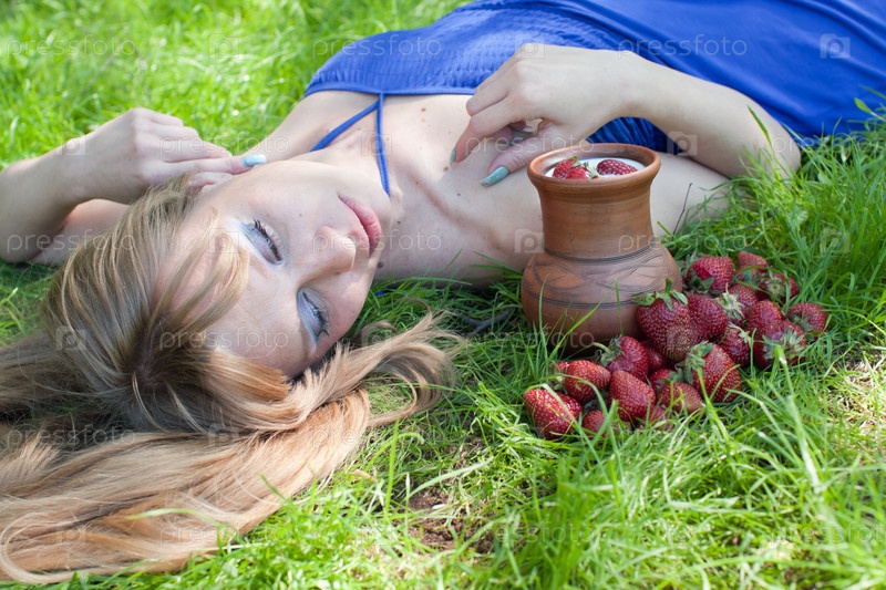 Молодая женщина с молоком и клубникой на зеленой траве