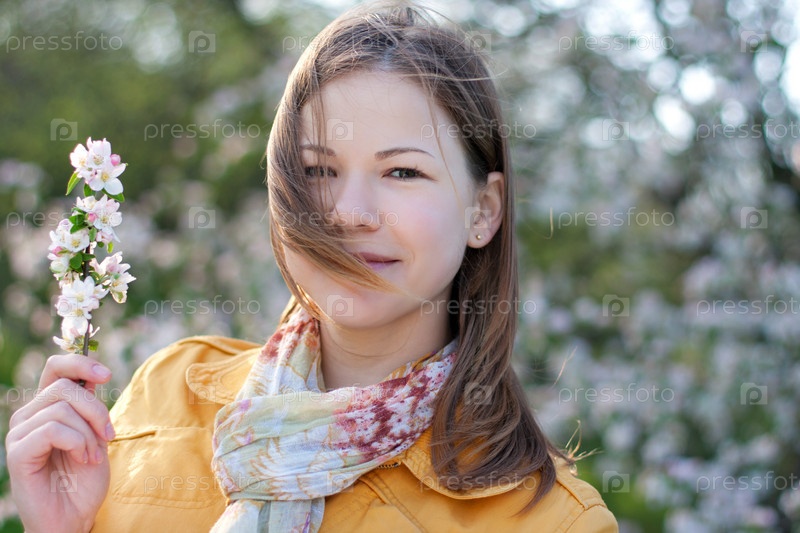 Молодая девушка с цветущей веточкой в руках