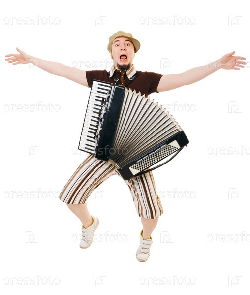 Музыкант с баяном на белом фоне