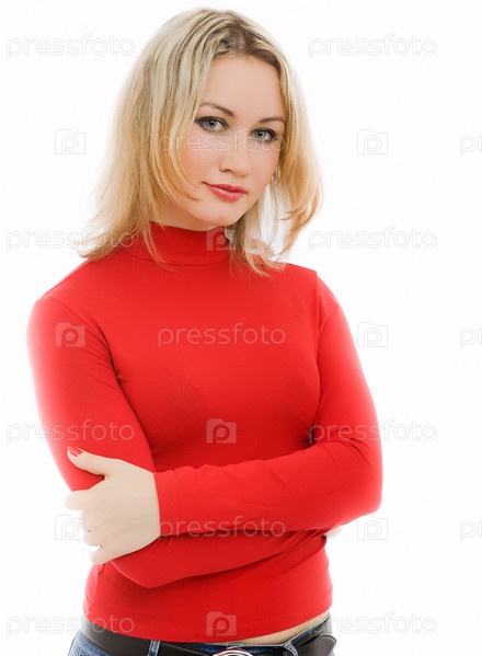 Девушка в красном свитере на белом фоне