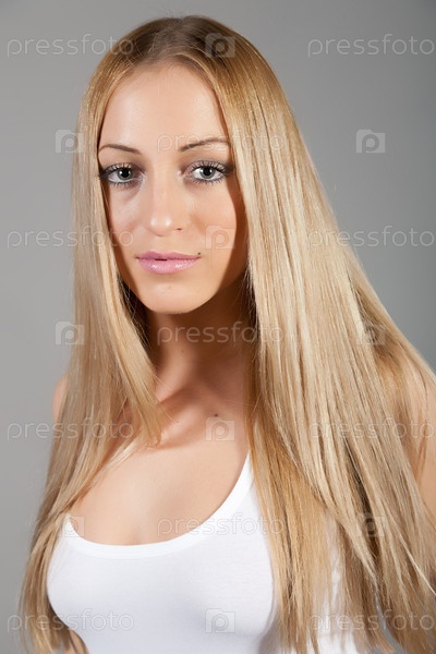 Портрет привлекательной блондинки в белом платье на сером фоне