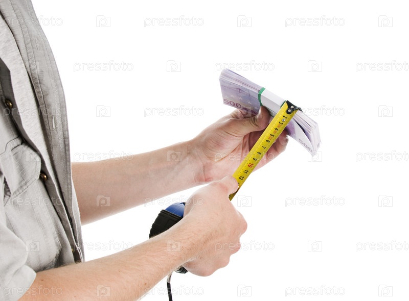 Человек измеряет толщину пачки купюр в 500 евро рулеткой