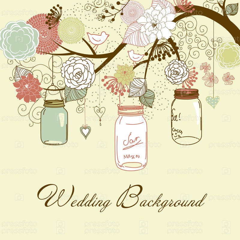 Цветочный летний фон. Стеклянные баночки висят на ветке