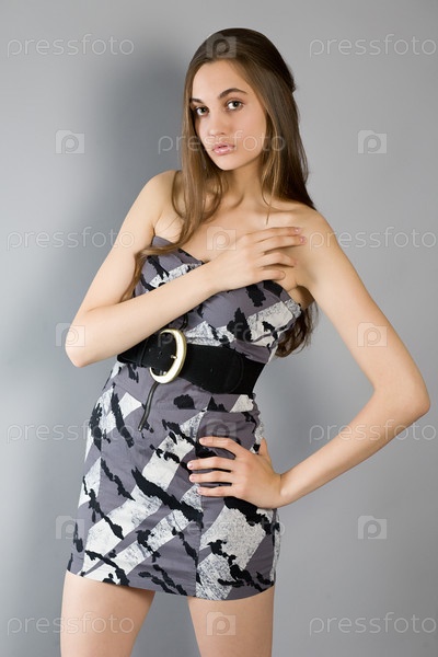 Портрет молодой девушки с длинными волосами в элегантном платье на сером фоне