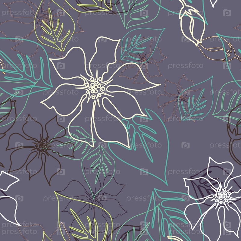 Нарисованные цветы и листья на синем фоне