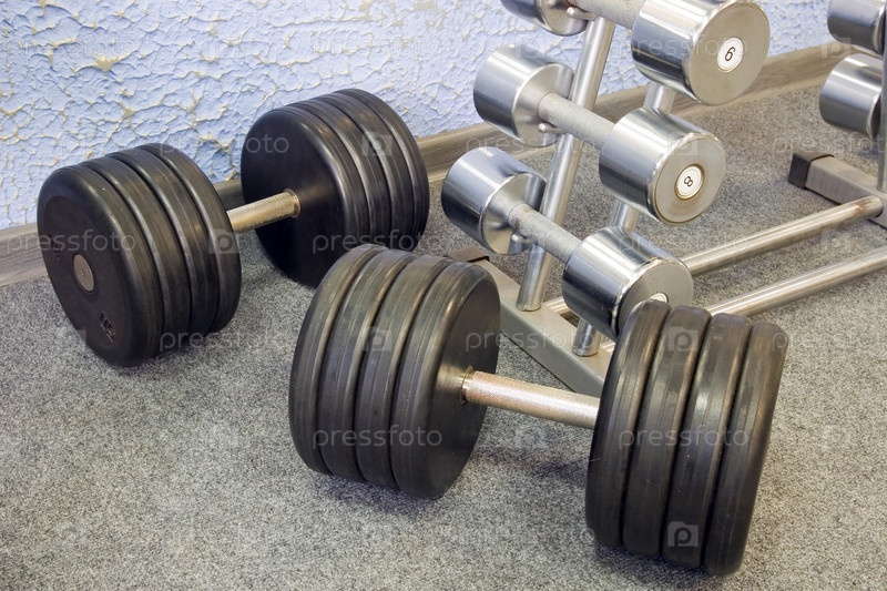 Гантели на стойке в зале