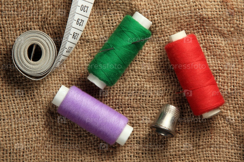 Катушки ниток, наперсток, сантиметровая лента лежат на мешковине