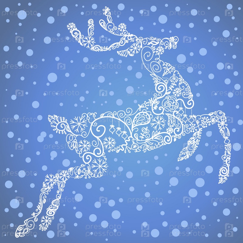Рождественская открытка с силуэтом оленя на голубом фоне со снежинками