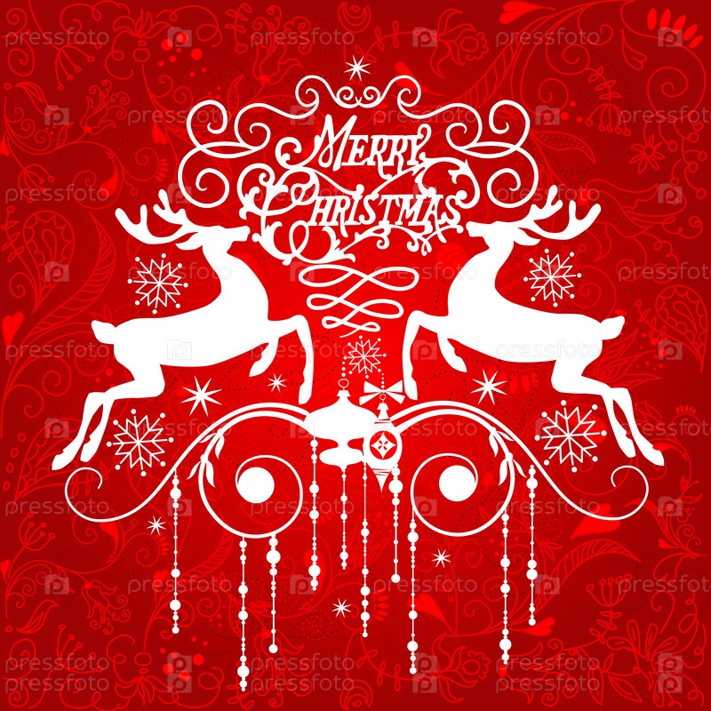 Красивая новогодняя открытка с двумя оленями на красном фоне