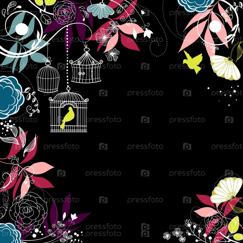 Фон с цветами и птицей в клетке
