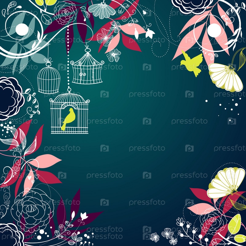 Фон с цветами и птицей в клетке