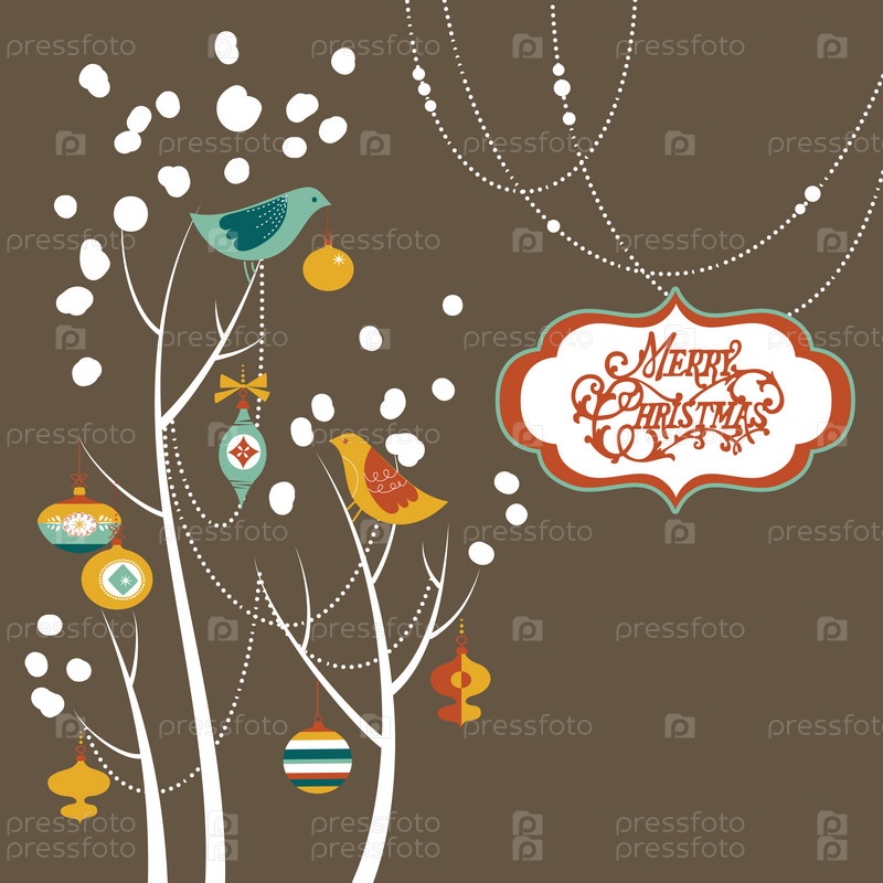 Старинная рождественская открытка с двумя птицами, белыми снежинками, зимними деревьями и украшениями
