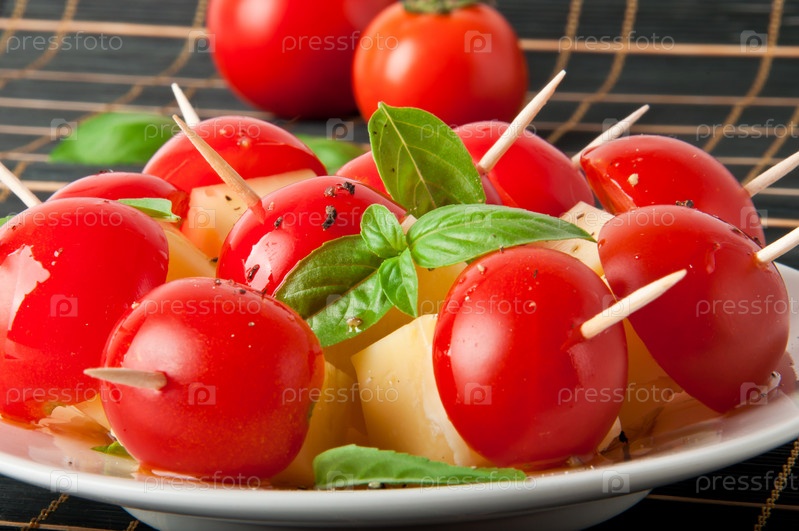 Ломтики помидоров и сыра, украшенные листьями базилика