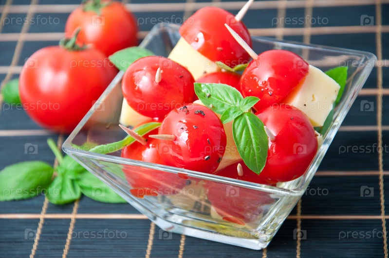 Ломтики помидоров и сыра, украшенные листьями базилика