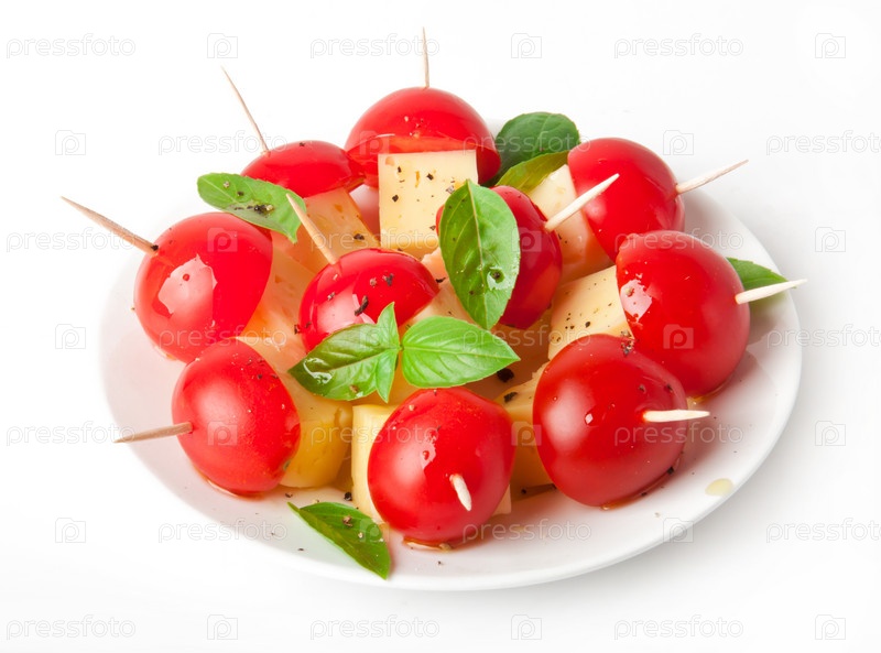 Ломтики помидоров и сыра, украшенные листьями базилика