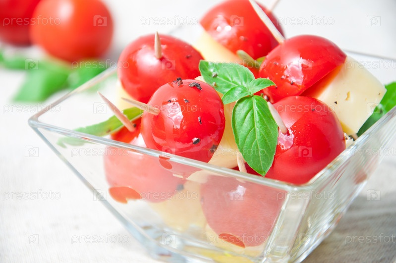 Ломтики помидоров и сыра, украшенные листьями базилика