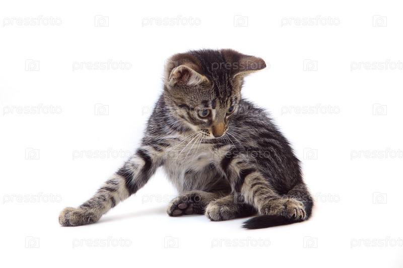 Полосатый серый котенок на белом фоне