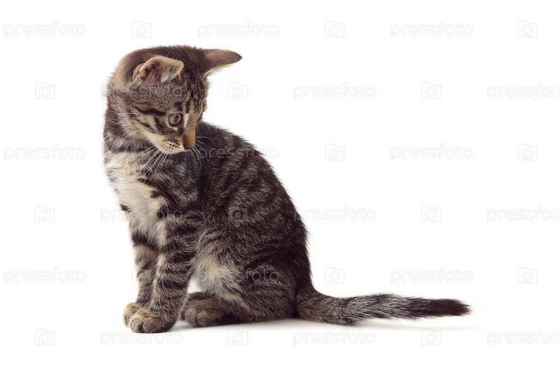 Полосатый серый котенок на белом фоне