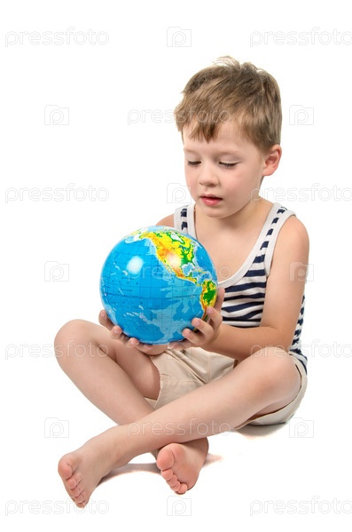 Мальчик с глобусом на белом фоне
