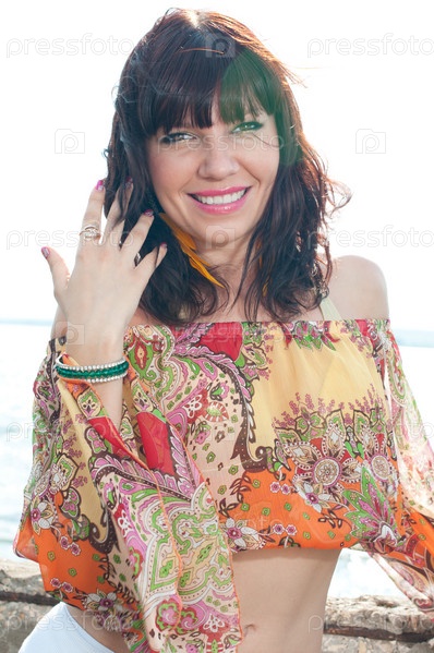 Молодая женщина стоит в лучах вечернего солнца, улыбается и смотрит в камеру