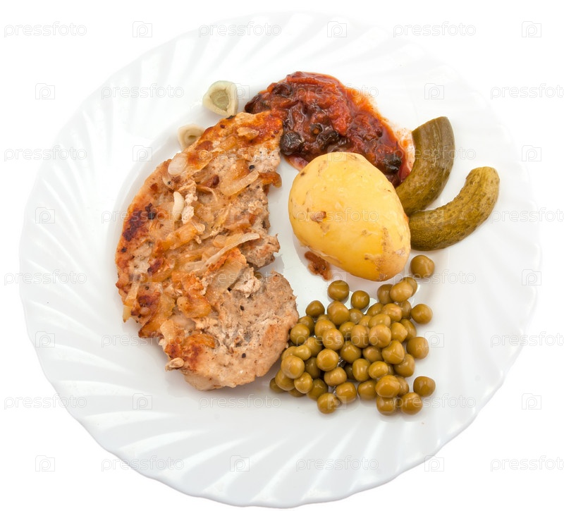 Свиной карбонад, отварной картофель, зеленый горошек и соус чатни
