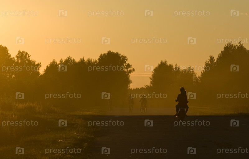 Золотой закат. Молодые люди катаются на велосипеде
