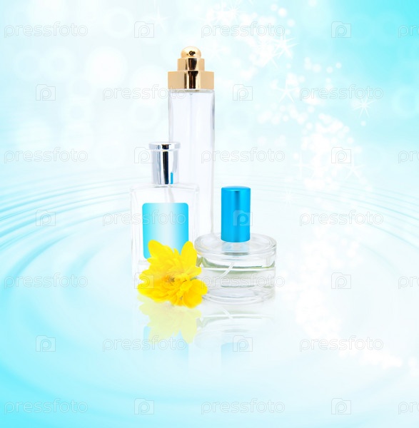 Флаконы с духами и хризантема на голубом фоне