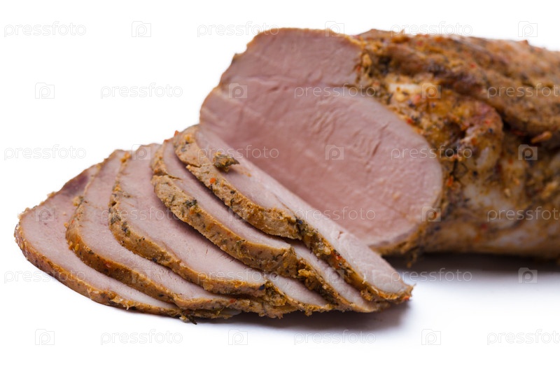 Ломтики вкусной ветчины на белом фоне