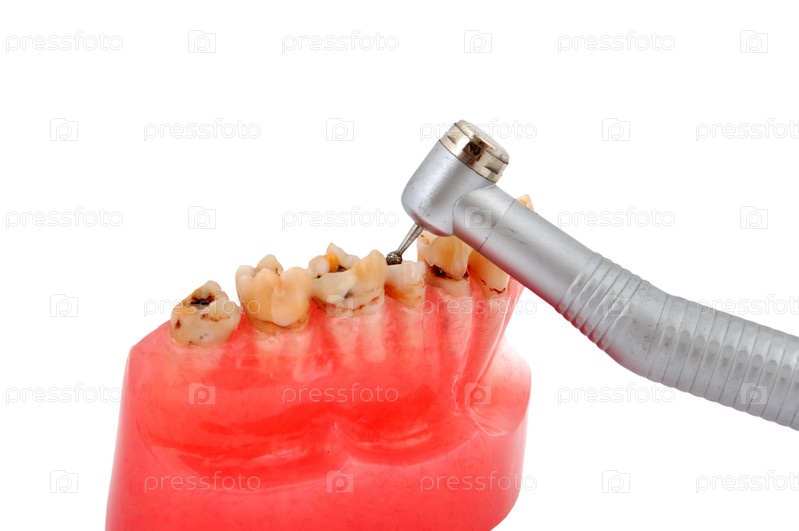 Челюсть с кариозными зубами и стоматологическая бормашина