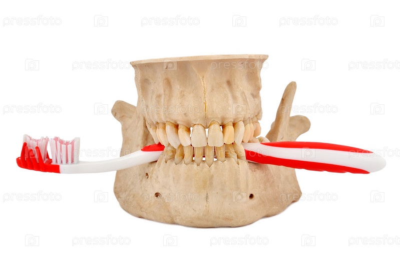 Модель человеческой челюсти и зубная щетка на белом фоне
