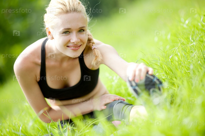 Привлекательная женщина занимается фитнесом и делает упражнение на растяжку