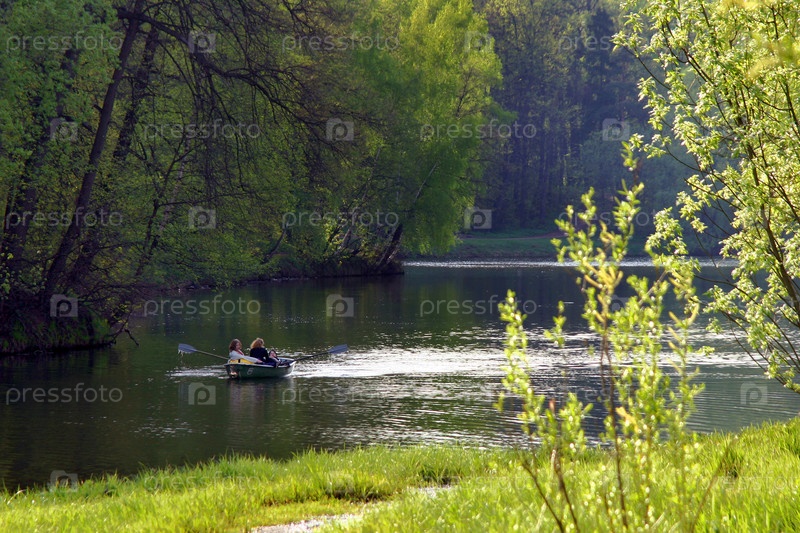 Девушки, плавающие в лодке на озере