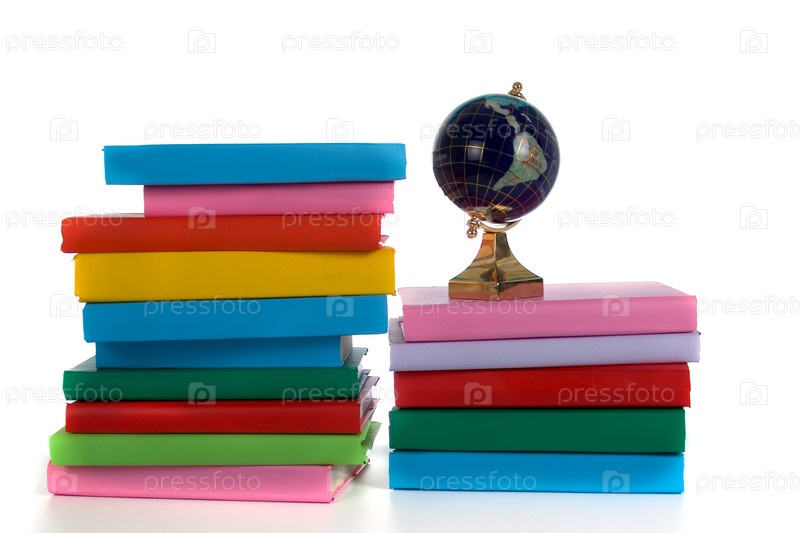 Стопка книг и глобус на белом фоне