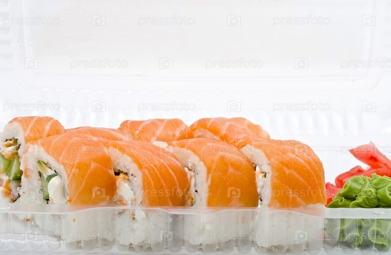 Роллы с лососем в пластиковом контейнере. Доставка суши