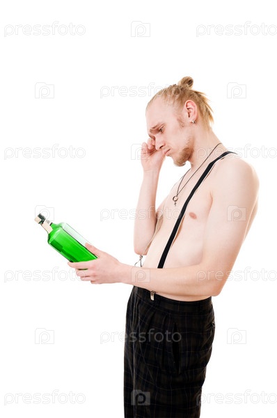 Молодой пьяный парень с бутылкой на белом фоне