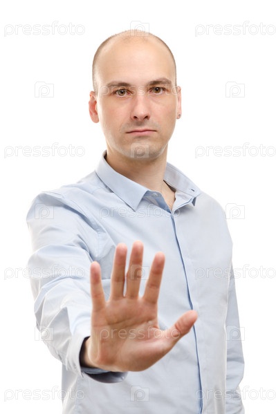 Предприниматель делает знак остановки, изолированный на белом