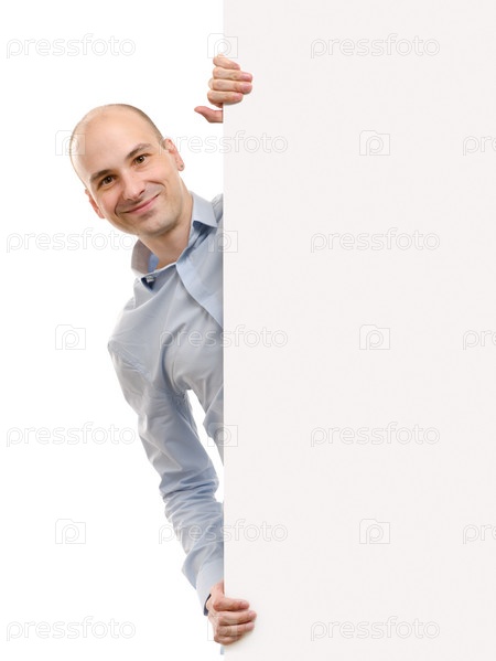 Улыбающийся красивый мужчина позирует за щитом