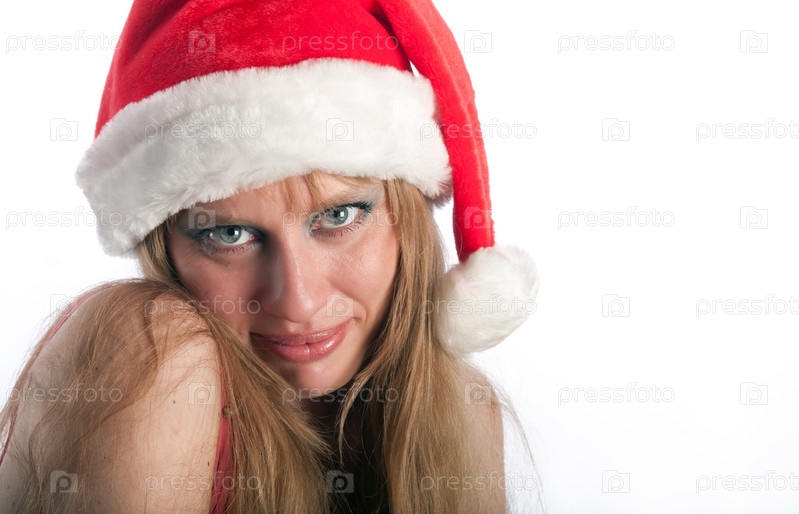 Лицо улыбающейся женщины в новогоднем колпаке на белом фоне