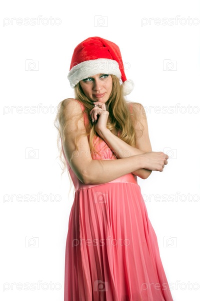 Женщина в розовом платье и новогоднем колпаке на белом фоне
