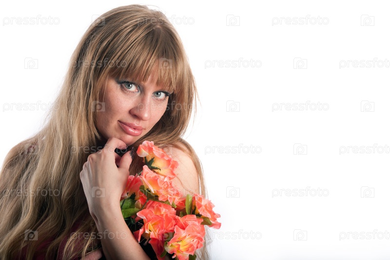 Женщина с букетом красных цветов на белом фоне