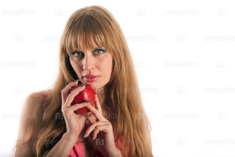 Длинноволосая женщина с красным яблоком на белом фоне