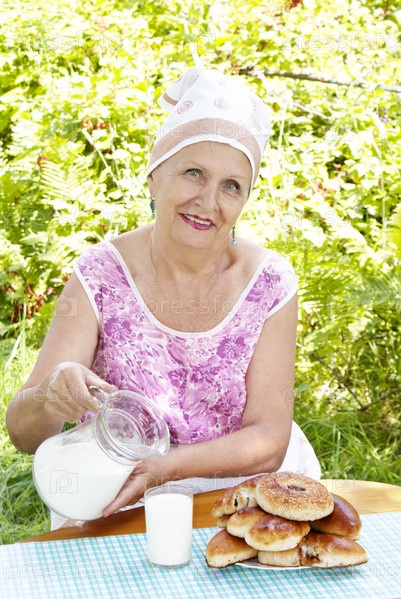Счастливая улыбающаяся женщина пьет парное молоко с румяными домашними пирожками