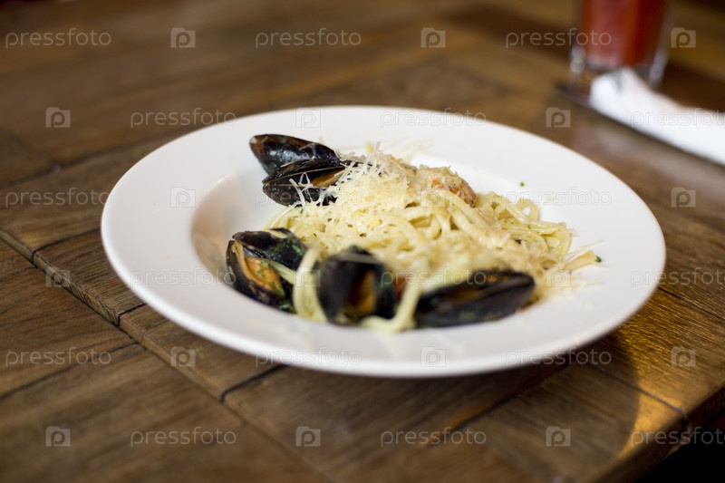Макароны со смесью моллюсков на блюде