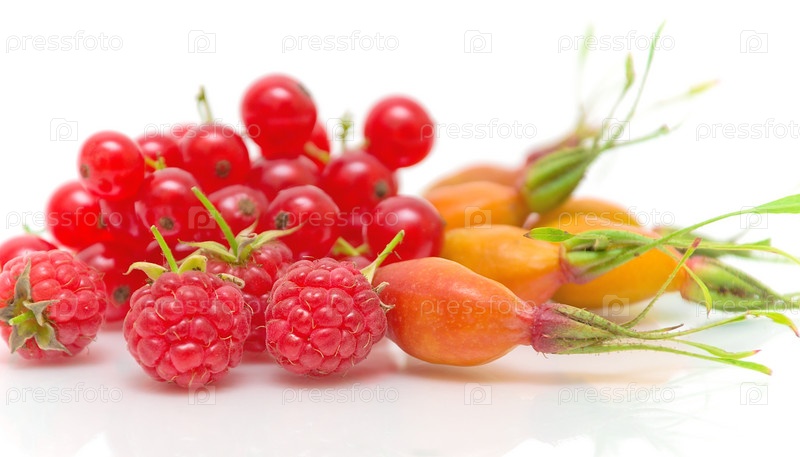 Малина, шиповник и красная смородина крупным планом на белом фоне