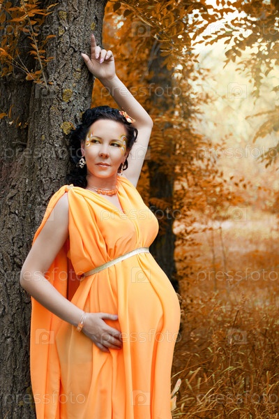 Беременная женщина стоит рядом с деревом