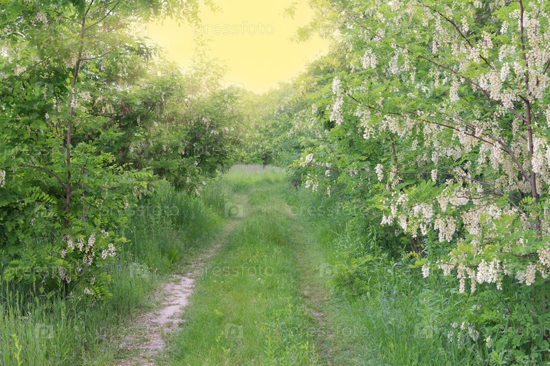 Кусты белой акации на лесной дороге