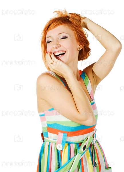 Счастливая рыжая девушка в сарафане