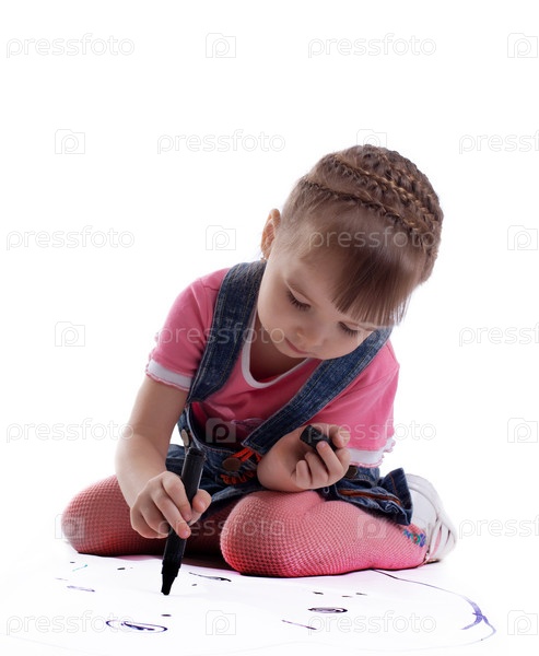 Милая девочка рисует на полу, изолированная на белом