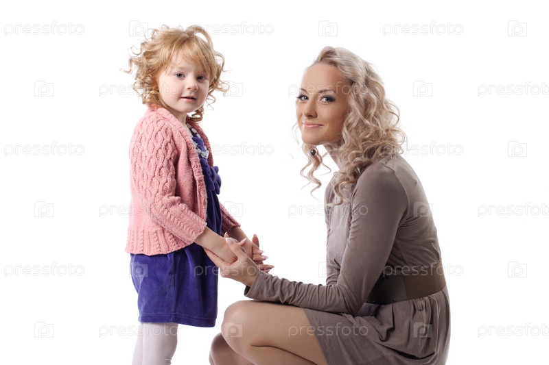 Счастливая мать и дочь, изолированные на белом
